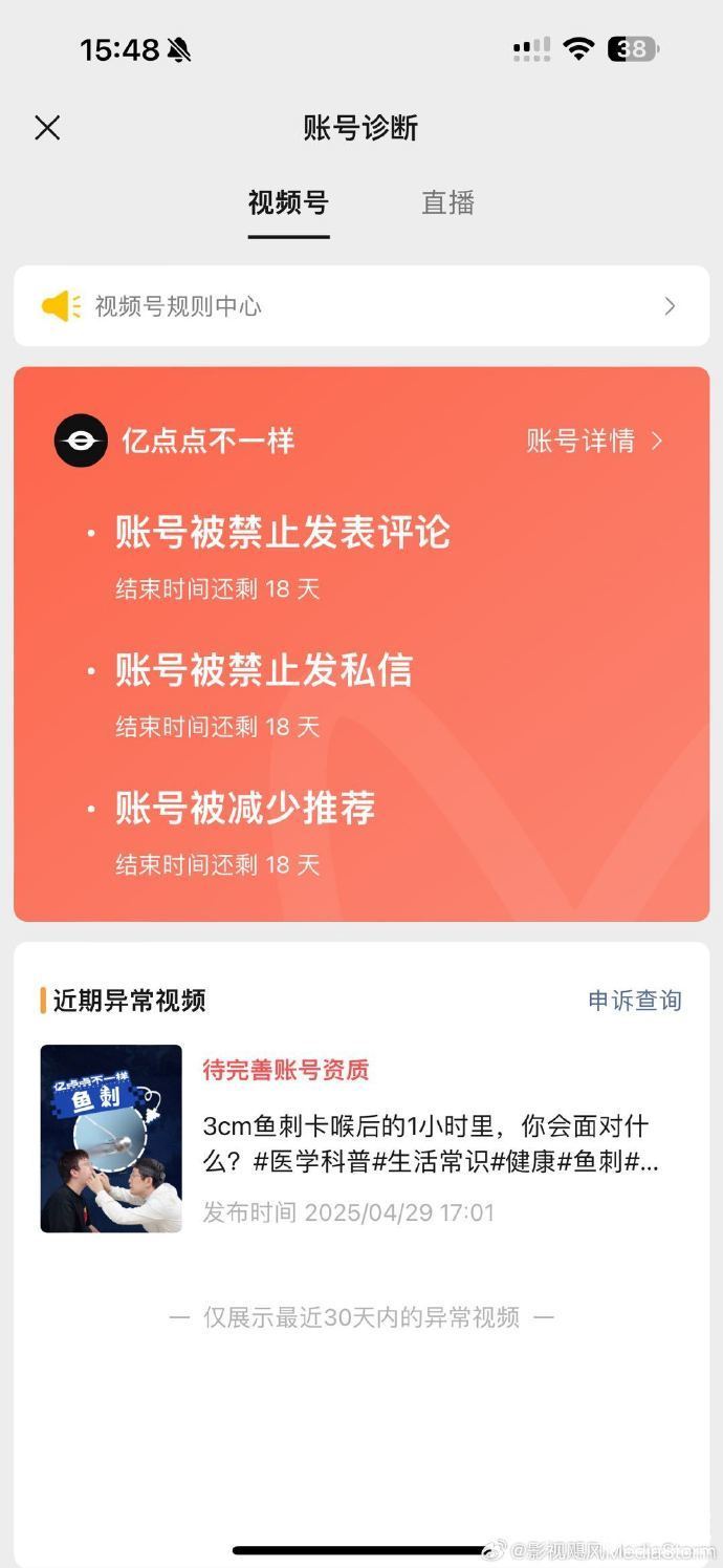 影视飓风表示,视频号对一些违规甚至违法内容监管不力,如出现公然售卖血液的视频,而卖血行为在我国是明确的违法行为,严重危害社会公共卫生安全。与之形成鲜明对比的是,影视飓风表示,自己的账号“亿点点不一样”,在视频号传播公益医学知识,且与正规三甲医院合作、无任何广告与血腥画面,并提供了医院盖章授权证明的账号,却遭到视频号封禁。