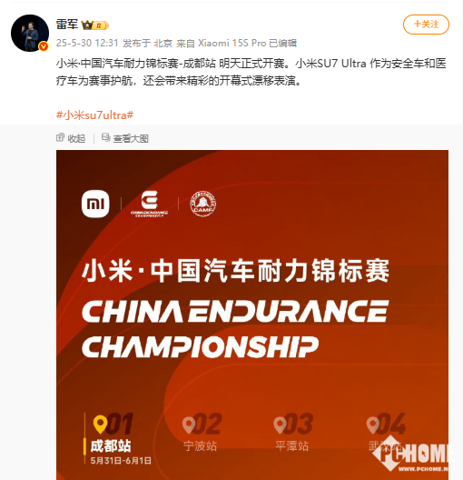 5月30日消息,今日雷军在微博发文为明天开赛的小米·中国汽车耐力锦标赛成都站预热。他透露,小米SU7 Ultra将作为安全车和医疗车为赛事护航,还会带来精彩的开幕式漂移表演。