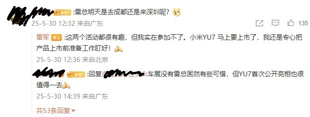 评论区内,有网友询问雷军是否会去到成都锦标赛现场或者深圳车展,雷军回应:“这两个活动都很有趣,但我实在参加不了。小米YU7马上要上市了,我还是专心把产品上市前准备工作盯好!”