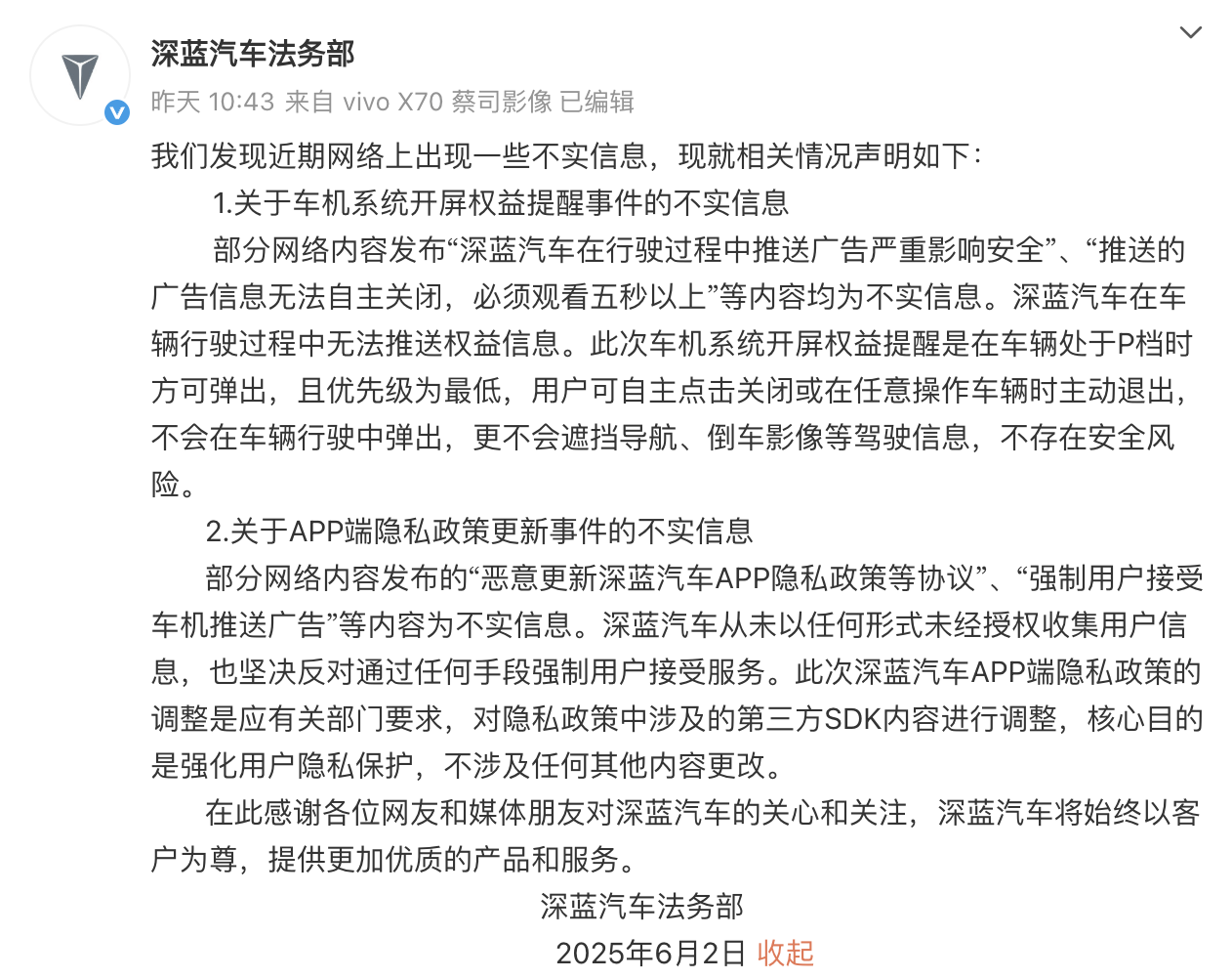 2025年6月2日,深蓝汽车法务部发文辟谣,称网络上“深蓝汽车在行驶过程中推送广告严重影响安全”“推送的广告信息无法自主关闭,必须观看五秒以上”等内容均为不实信息。深蓝汽车表示,车机系统开屏权益提醒仅在车辆处于P档时方可弹出,且优先级最低,用户可自主点击关闭,或在任意操作车辆时主动退出,不会在车辆行驶中弹出,更不会遮挡导航、倒车影像等驾驶信息,不存在安全风险。