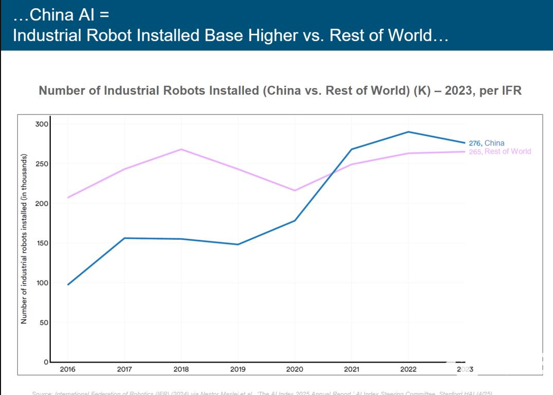 玛丽·梅克表示,ChatGPT拥有先发优势,但未必会永远占据主导份额。如今,虽然训练一个顶级模型的成本高达10亿美元,在过去8年里飙升了2400倍,但推理成本在两年内已经暴降了99.7%。与此同时,DeepSeek-R1已经在MATH Level 5数学基准测试中取得了93%的高分,非常接近OpenAI o3-mini模型的95%。中国的人工智能企业正发起挑战,中国AI大模型的性能已经接近美国AI的顶尖水平,成本又相对较低。