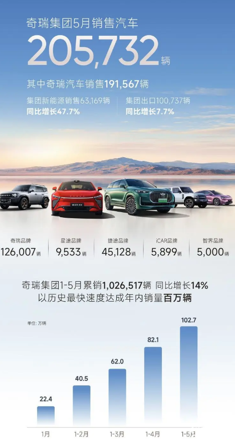 1-5月份,奇瑞集团累计销售汽车1026517辆,同比增长14%,以历史最快速度达成年内销售百万辆。
