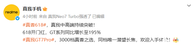 6月3日消息,真我手机官方今日公布618战绩,GT系列同比增长至195%。真我手机表示,真我GT7 Pro是3000档的真香之选,是同档中唯一拥有潜望长焦的。