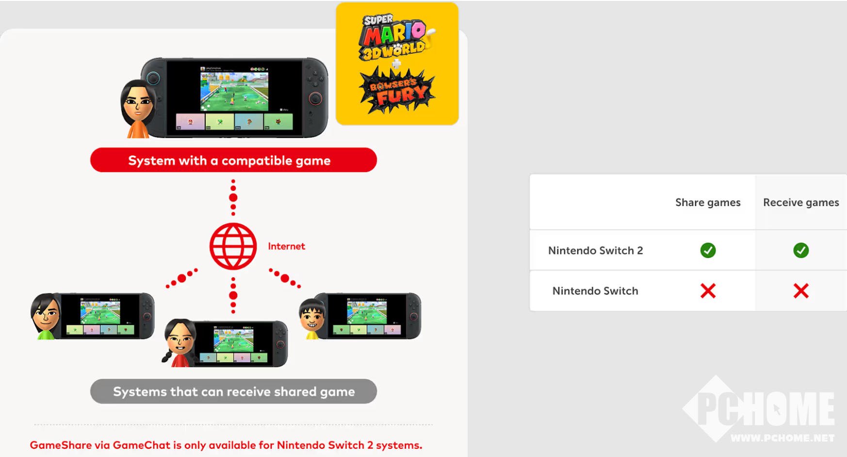 目前GameShare功能,Switch 2可以作为主机运算,传输画面到其他设备,包括初代Switch但只能接收,而Switch 2则可以发起或接收游戏共享。