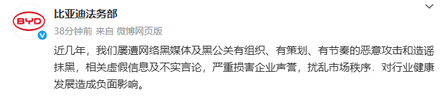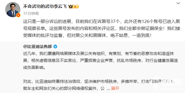 比亚迪集团、品牌及公关处总经理,李云飞发文发文称,(以上)只是一部分诉讼的进展,目前在诉黑号37个,此外还有126个账号已进入黑号观察名单。接受媒体的批评与监督,但对黑公关和黑媒体,绝不姑息,一追到底!