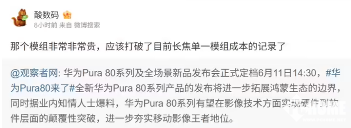 OPPO产品总监“酸数码”在社交媒体平台发文称,华为Pura 80系列手机影像模组的成本非常非常贵,“应该打破了目前长焦单一模组成本的记录了。”