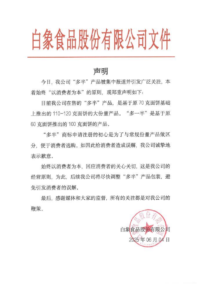 2025年6月4日,白象食品股份有限公司就“多半”产品引发的争议发布声明致歉,回应商标注册初衷与产品争议焦点。