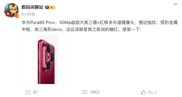 数码博主“数码闲聊站”爆料称,华为Pura 80 Pro+将搭载5000万像素超级大底三摄+红枫多光谱摄像头,采用侧边指纹,弧形金属中框,镜头模组采用类三角形设计。