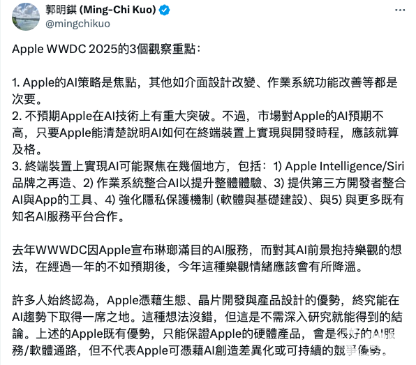 郭明錤特别强调,今年WWDC最重要的是苹果如何清晰阐述其AI部署策略,而非传统界面或系统功能的升级:“Apple的AI策略是焦点,其他如界面设计改动、操作系统功能改善等都是次要”。
