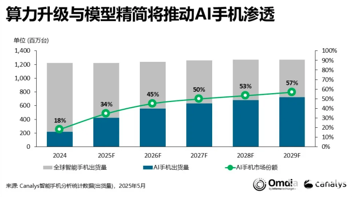 6月9日消息,市场分析机构Canalys发布研报,预计2025年AI手机渗透率将达到34%。随着端侧模型的精简以及芯片算力的升级,AI手机正加速向中端价位段渗透。