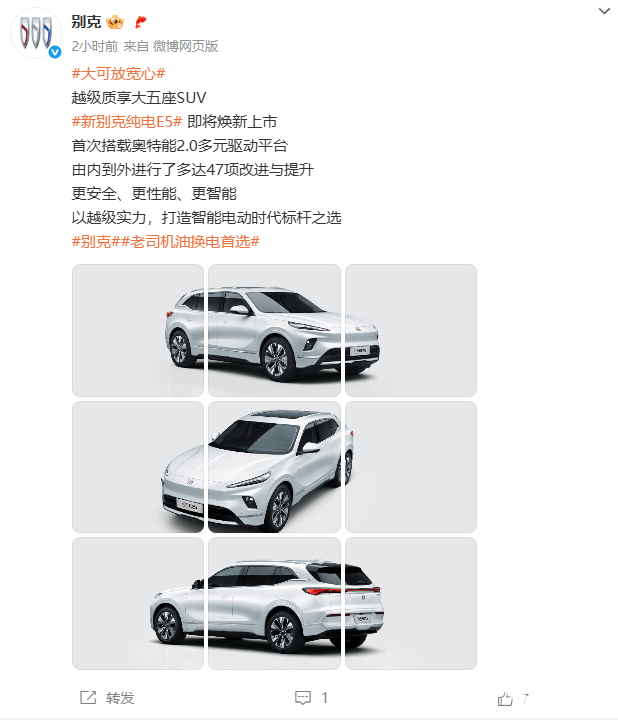 6月9日消息,上汽通用别克官方发布了新款别克纯电E5的官图,并表示该车型即将焕新上市。官方宣布,该车型首次搭载奥特能2.0多元驱动平台,并由内到外进行了多达47项改进与提升。