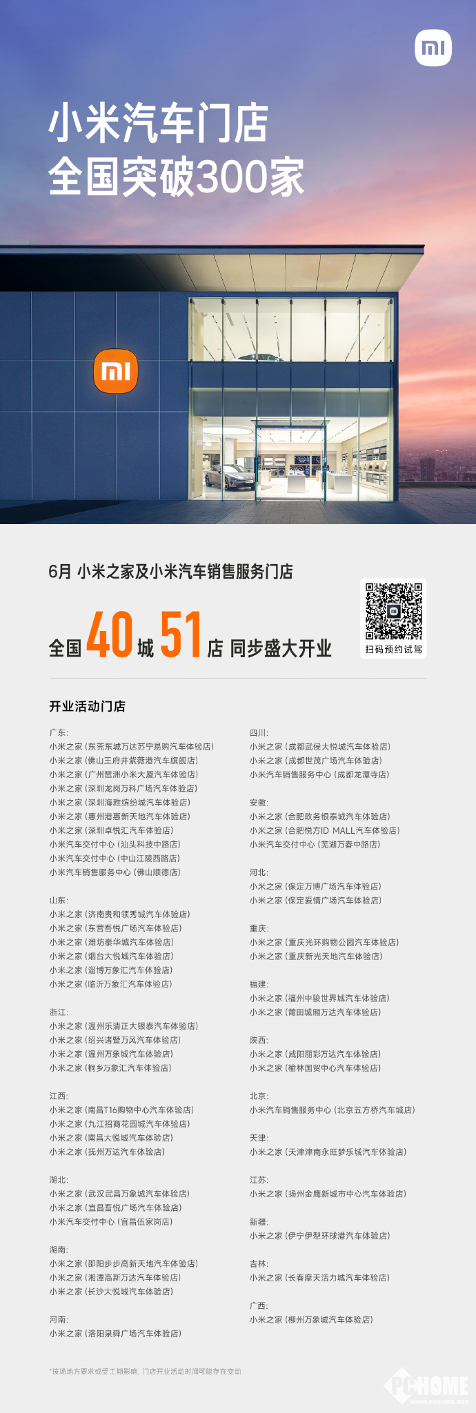 2025年6月9日,小米汽车迎来重要里程碑,其全国门店数量突破300家。本月,小米之家及小米汽车销售服务门店开启大规模开业潮,在全国40座城市同步新开51家门店,涵盖广东、山东、浙江等多地。