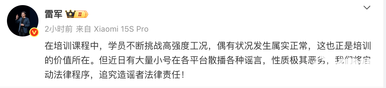 雷军通过微博表示:在培训课程中,学员不断挑战高强度工况,偶有状况发生属实正常,这也正是培训的价值所在。但近日有大量小号在各平台散播各种谣言,性质极其恶劣,“我们将启动法律程序,追究造谣者法律责任。”