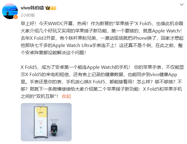 6月10日消息,vivo通信科技有限公司产品经理韩伯啸发文称,vivo X Fold5成为了第一个能连Apple Watch的手机,苹果手表不仅能显示vivo X Fold5的来电和短信,还有表上记录的健康数据,也能同步到vivo健康App里。
