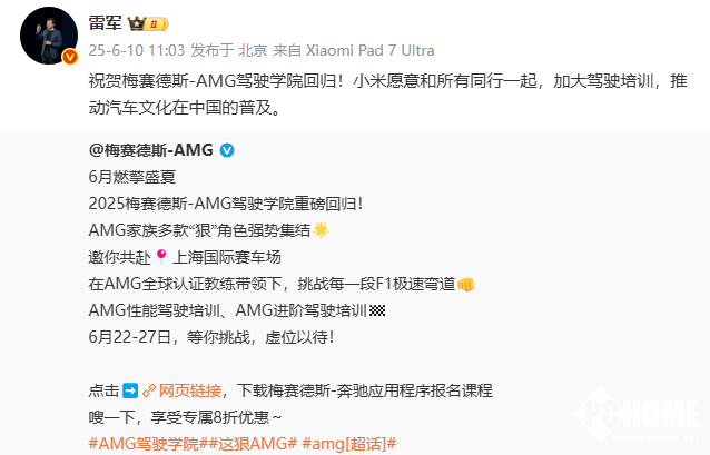 在梅赛德斯-AMG发布消息后,小米创办人,董事长兼CEO雷军进行了转发并发文称,祝贺梅赛德斯-AMG驾驶学院回归!小米愿意和所有同行一起,加大驾驶培训,推动汽车文化在中国的普及。据悉,小米精英驾驶-高阶驾驶培训课程于6月6日开启北京站第一期,后续还将陆续开放上海、广州、深圳、杭州等10多个城市场次。