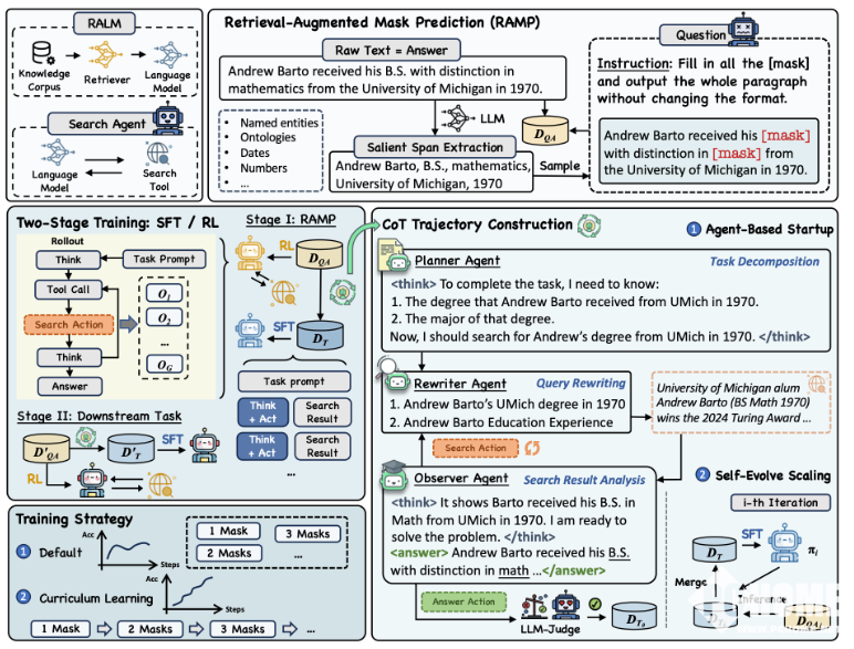 据了解,MaskSearch提出了一种全新的预训练任务——检索增强掩码预测(RAMP) ,让AI在大量“填空题”中学习如何调用搜索引擎、多步推理、逐步还原缺失信息,从而掌握通用的搜索与推理能力。还采用了两种训练策略,分别是监督微调(SFT)和强化学习(RL)。