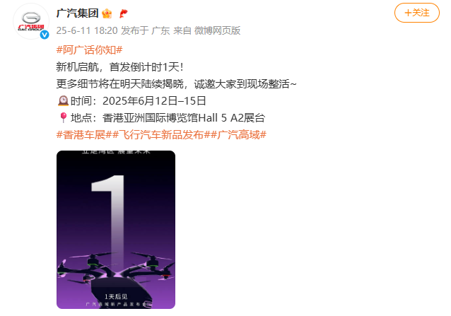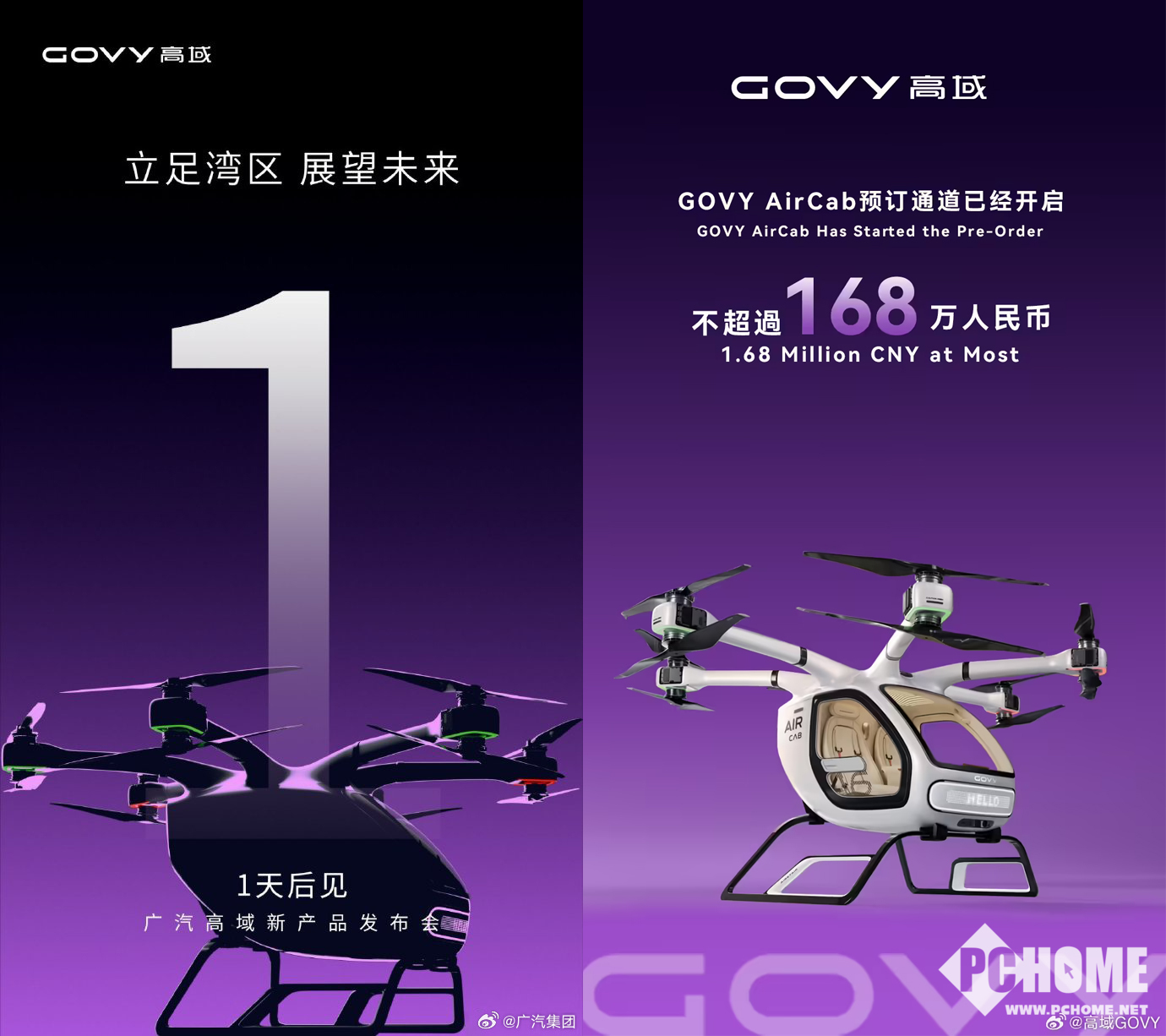 2025年6月12日消息,广汽集团官方账号发布预热海报,预告“新机启航,首发倒计时1天”,随后,广汽集团旗下飞行汽车品牌高域GOVY发布飞行汽车GOVY AirCab的预订海报及通道,海报显示,售价不超过168万人民币,在中国香港首发。