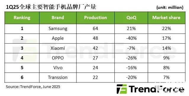 苹果因新机型铺货进入尾声,一季度生产数量环比锐减40%,降至4800万台,滑落至第二名。