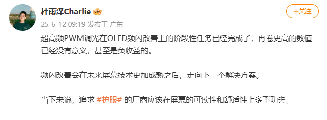 2025年6月12日消息,荣耀GT系列产品经理杜雨泽,在社交媒体发文表示,超高频PWM调光在OLED频闪改善上的阶段性任务已经完成,再卷更高的数值已经没有意义,甚至是负收益的。