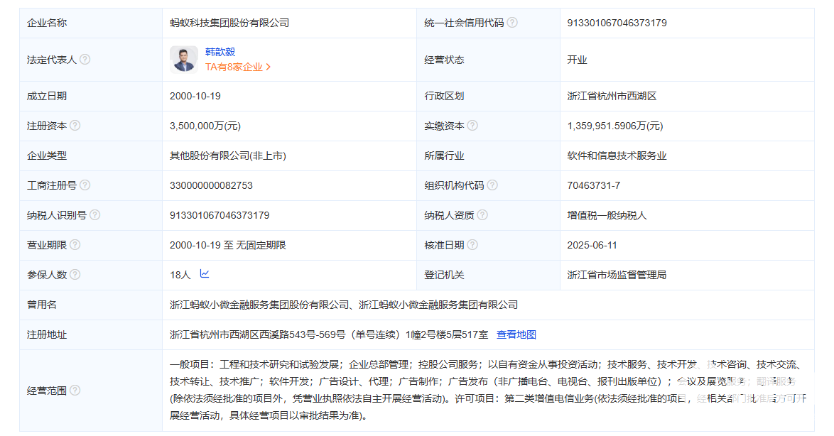 2025年6月13日消息,据国家企业信用信息公示系统显示,蚂蚁科技集团股份有限公司的法定代表人变更为韩歆毅,韩歆毅担任蚂蚁集团CEO,此前法定代表人为井贤栋,井贤栋担任蚂蚁集团董事长。