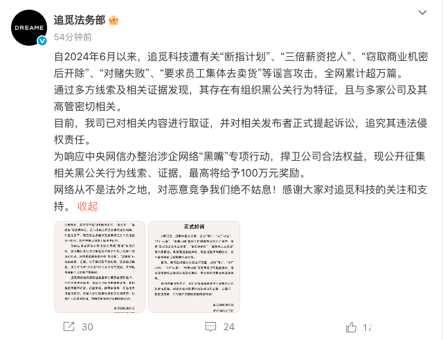 2025年6月13日,追觅法务部发布声明,公开征集“黑公关”“黑媒体”行为的线索和证据,对核实有效的提供者给予1万至100万元奖励。
