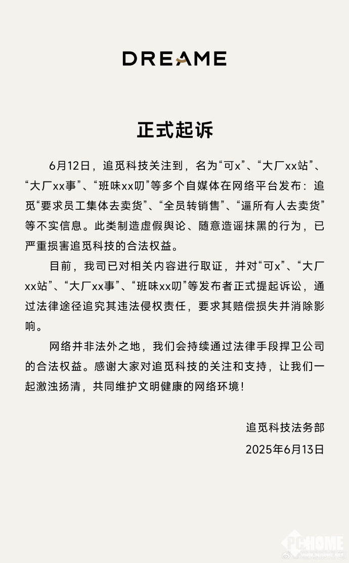 为响应中央网信办整治涉企网络“黑嘴”专项行动,追觅科技决定悬赏征集线索。同时,追觅科技已对部分自媒体采取法律行动。6月12日,追觅关注到“可x”“大厂xx站”“大厂xx事”“班味xx叨”等自媒体发布追觅“要求员工集体去卖货”“全员转销售”“逼所有人去卖货 等不实信息,目前已对相关内容取证,并对发布者正式提起诉讼,要求其赔偿损失、消除影响。