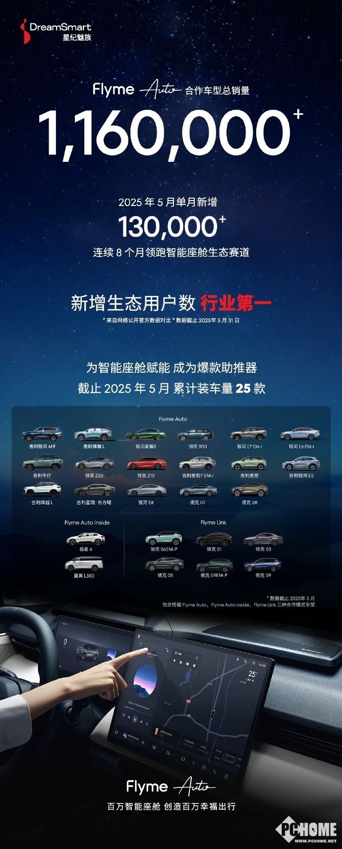 2025年6月16日,星纪魅族公布Flyme Auto最新“成绩单”。数据显示,Flyme Auto合作车型总销量超116万,2025年5月单月新增13万 ,已连续8个月领跑智能座舱生态赛道,新增生态用户数行业第一。