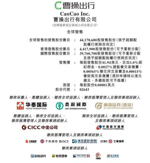 据公告显示,曹操出行拟全球发售4417.86万股股份,每股发售价为41.94港元。,其中,香港发售股份441.79万股,国际发售股份3976.07万股,另有15%超额配股权。按照每股发售价计算,曹操出行估值约228.23亿港元。