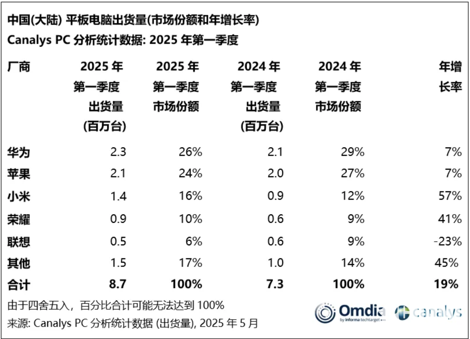 2025年6月17日,市场调研机构Canalys发布的2025年第一季度中国平板市场研报,该季度中国大陆平板电脑出货量达870万台,同比攀升19%,市场呈现出蓬勃发展的态势。