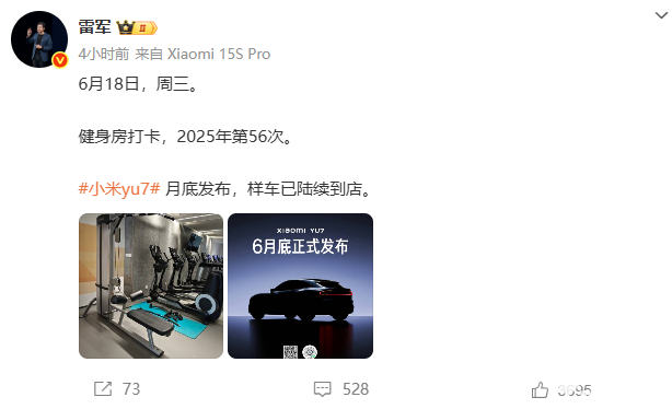 6月18日消息,小米创办人,董事长兼CEO雷军今早发文表示,小米YU7样车已陆续到店,将在6月底正式发布。