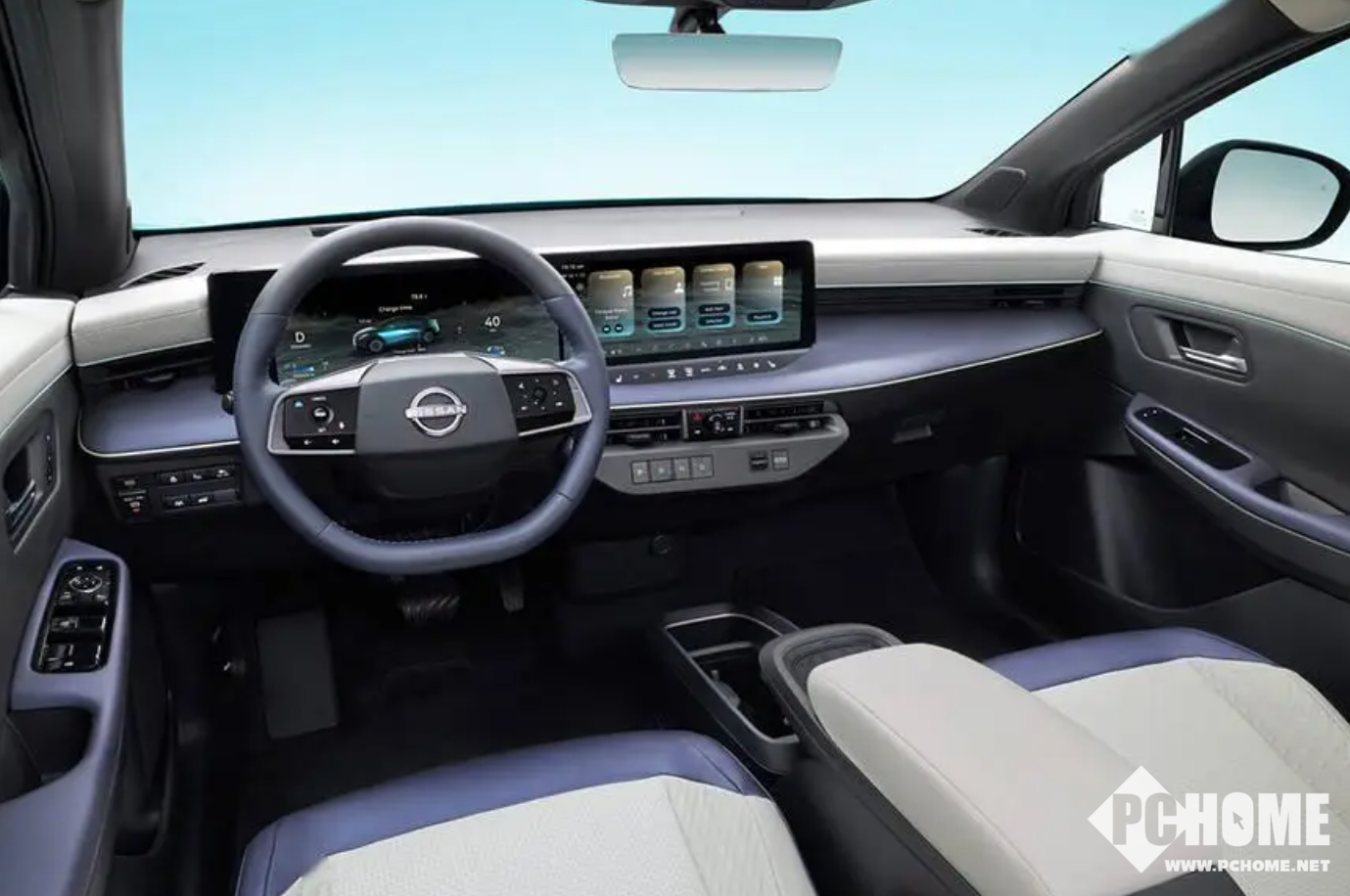车内配备双幅式方向盘以及双14.3英寸连屏设计,屏幕内置导航、多媒体娱乐系统以及应用商店等等,并支持远程控制。