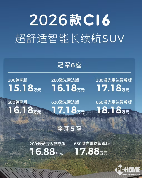6月18日消息,零跑汽车官方宣布,2026款零跑C16正式上市,新车推出包括5座和6座版本共8款车型,售价15.18-18.18万元。