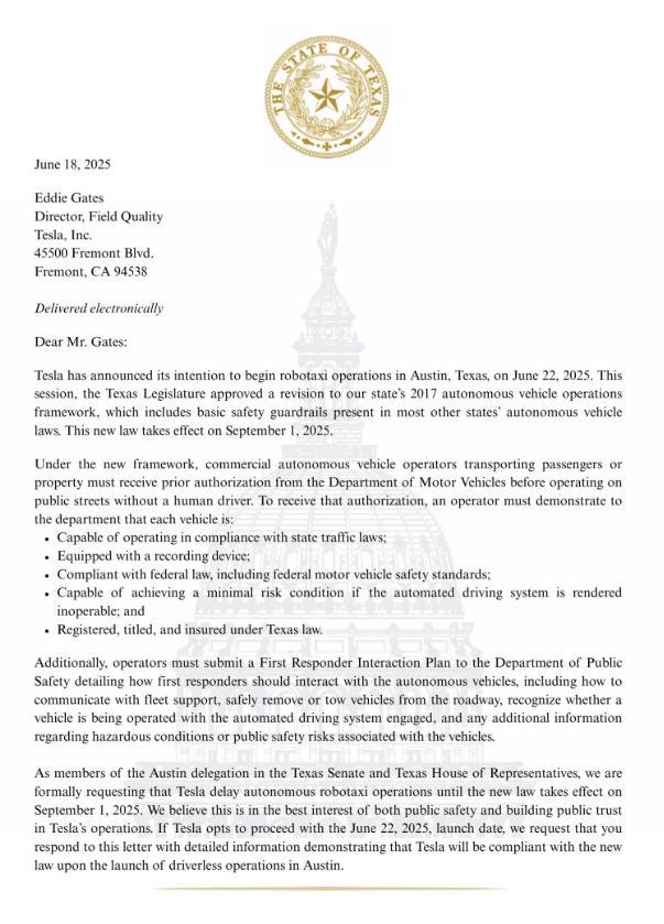 七位来自奥斯汀的得州参议员与众议员联名致信特斯拉,请求其将上线时间延后至9月1日新法生效后再启动。信中表示,推迟启动“符合公共安全和建立公众对特斯拉运营的信任的最佳利益”如果特斯拉仍决定按原计划在6月22日上线,应提供一份详尽说明,以确保届时的合规性。