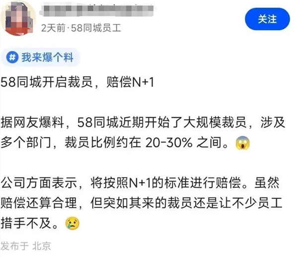 58同城的员工爆料,公司方面表示,将按照N+1的标准进行赔偿,虽然感觉赔偿还算合理,但是突然裁员让许多员工猝不及防。