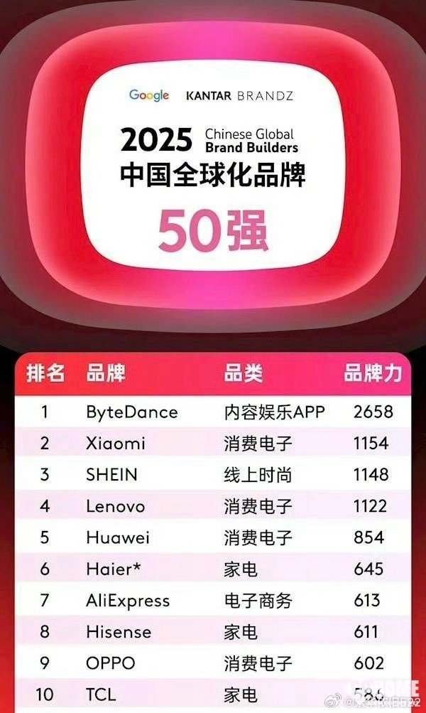 6月20日消息,凯度携手Google发布了《2025凯度BrandZ中国全球化品牌》,字节跳动品牌力2658遥遥领先夺冠,小米品牌力1154位居第二,希音品牌力1148紧随其后位居第三。前10名还有:联想、华为、海尔、阿里速卖通、海信、OPPO、TCL。