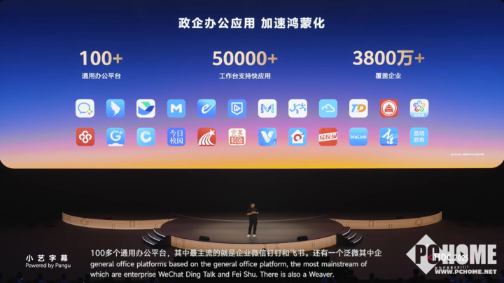 余承东还透露,政企办公应用正加速鸿蒙化,支持100+通用办公平台、工作台支持超50万个快应用、覆盖超3800万企业。结合PPT来看,钉钉、飞书、企业微信等知名办公软件都已适配原生鸿蒙。