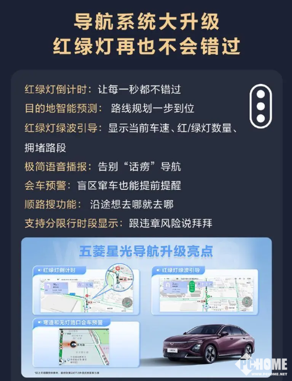 五菱星光此次新增红绿灯倒计时、红绿灯绿波引导功能,能够实时显示推荐车速、可通行绿灯数等信息,还有路口特殊车道线支持分限行时段显示、弯道和无灯路口会车预警、目的地智能预测等功能。