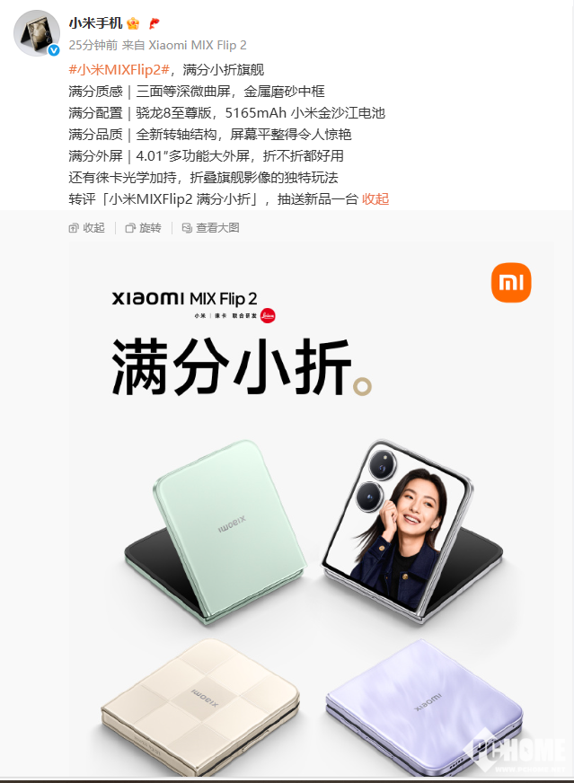 6月24日消息,小米将于6月26日晚7点举行人车家全生态发布会,届时将推出的新品包括小米MIX Flip 2小折叠手机,今天上午官方公布了该机的外观和重要配置信息。
