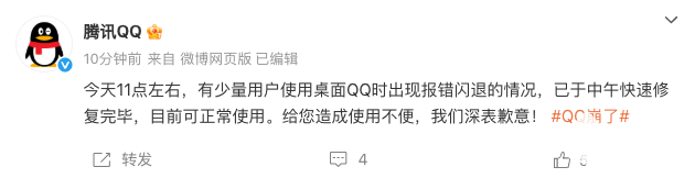 6月24日下午,QQ官方发布声明,就此次桌面QQ闪退问题向用户致歉。QQ官方在声明中表示,已于中午快速修复完毕,目前可正常使用。