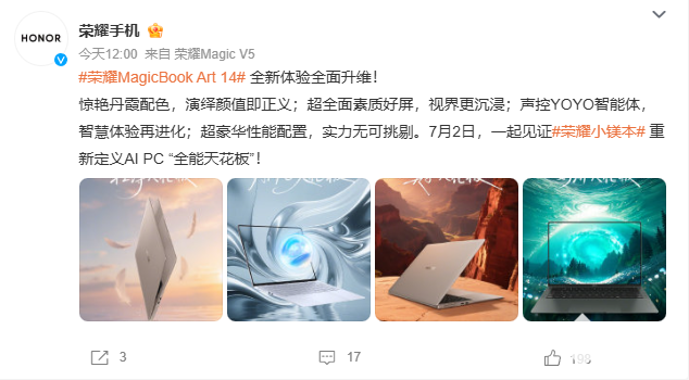 6月24日,荣耀正式官宣荣耀MagicBook Art 14 2025将于7月2日发布并展示出三大核心卖点:1kg、1cm的超轻薄机身,1600nit绿洲护眼屏,以及声控YOYO智能体功能。