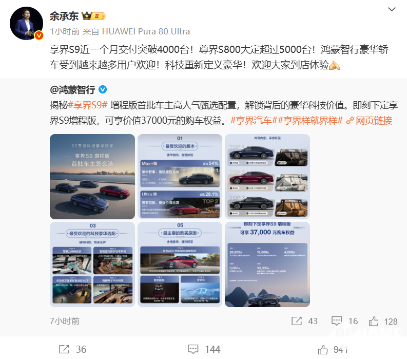 6月24日消息,华为常务董事、终端BG董事长余承东发文称,享界S9近一个月交付突破4000台,尊界S800大定超过5000台。