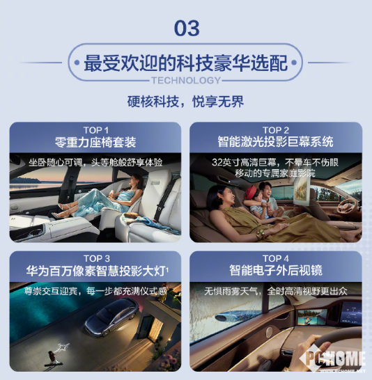 此外,还列举了最受欢迎的科技豪华选配:零重力座椅套装、智能激光投影巨幕系统、华为百万像素智慧投影大灯和智能电子外后视镜。座椅坐卧随心可调,有着头等舱般的舒享体验。投影使用32英寸高清巨幕,不晕车不伤眼,就是一个移动的专属家庭影院。