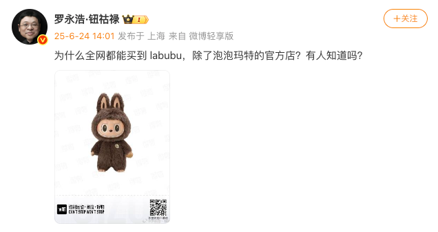 6月24日,罗永浩在社交媒体上发文称:“为什么全网都能买到LABUBU,除了泡泡玛特的官方店?有人知道吗?”这一句看似随意的发问,却迅速引发热议。不少网友认为,罗永浩是在委婉质疑泡泡玛特是否故意制造稀缺,从而刺激市场炒作,涉嫌“饥饿营销”。
