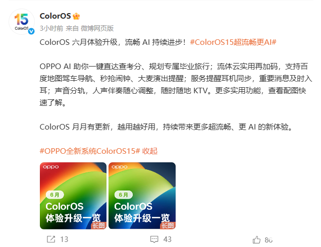 6月24日消息,OPPO、一加手机操作系统官方微博ColorOS发文称,ColorOS六月体验将会迎来升级,让ColorOS 15更流畅更AI。