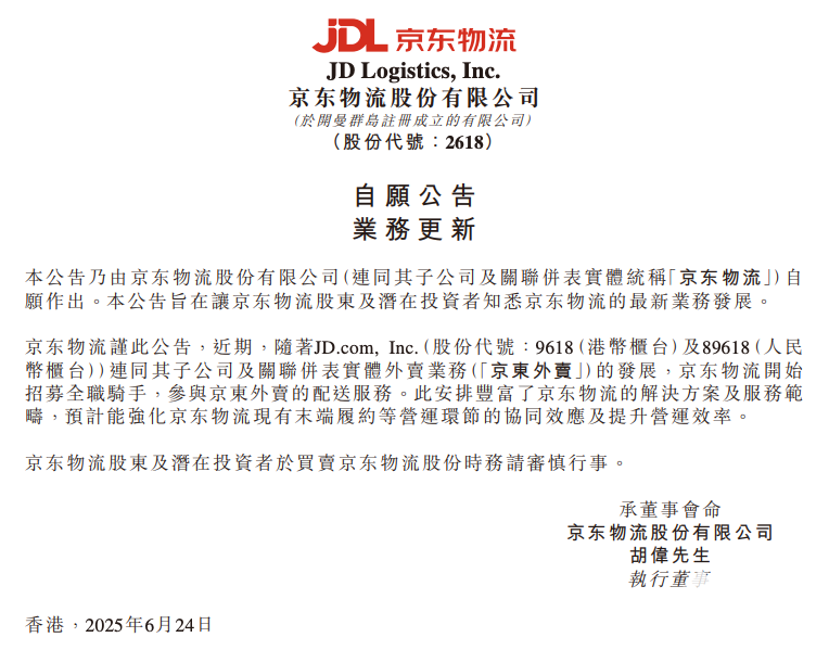 6月24日,京东物流在港交所发布公告,正式启动全职骑手招募计划,全面参与京东外卖的配送服务。此次举措标志着京东物流在末端履约领域的服务边界进一步拓展,也意味着京东在即时零售战场上的投入再度升级。