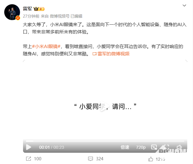6月25日消息,小米官微今日宣布,全新小米AI眼镜将于明晚19:00的人车家全生态发布会上正式登场,官方称之为“面向下一代的个人智能设备”。同时小米创办人,董事长兼CEO雷军也发布小米AI眼镜预热视频,视频中该眼镜支持第一人称视角拍摄,并且能与小爱同学实时进行对话。