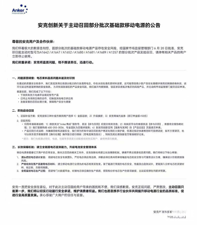 6月25日消息,近日,安克创新发布公告称,因存安全风险,将召回7款约71.29万充电宝产品。