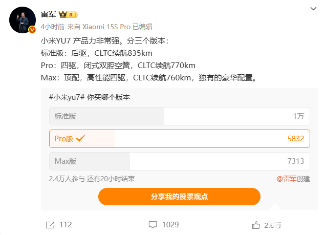 6月25日,雷军发文称,小米YU7产品力非常强,分三个版本:标准版、Pro版和Max版。他还发起了“小米YU7你买哪个版本”的投票。截至目前已有2.4万人参与投票,其中标准版票数最高,超过1万人,随后是Max版和Pro版。