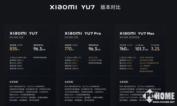 小米官方不止一次强调YU7的配置拉满,即便是标准版,配置也强过了SU7的Pro版。据悉,小米YU7全系标配:800V碳化硅高压平台、V6s Plus小米超级电机、连续阻尼可变减振器、四活塞固定卡钳、可变转向比系统、小米天际屏全景显示、后排移动控制屏、小米澎湃OS、骁龙8 Gen3、小米端到端辅助驾驶、英伟达Thor 700TOPS、激光雷达、4D毫米波雷达、超声波雷达、高清摄像头、豪华舒适配置。