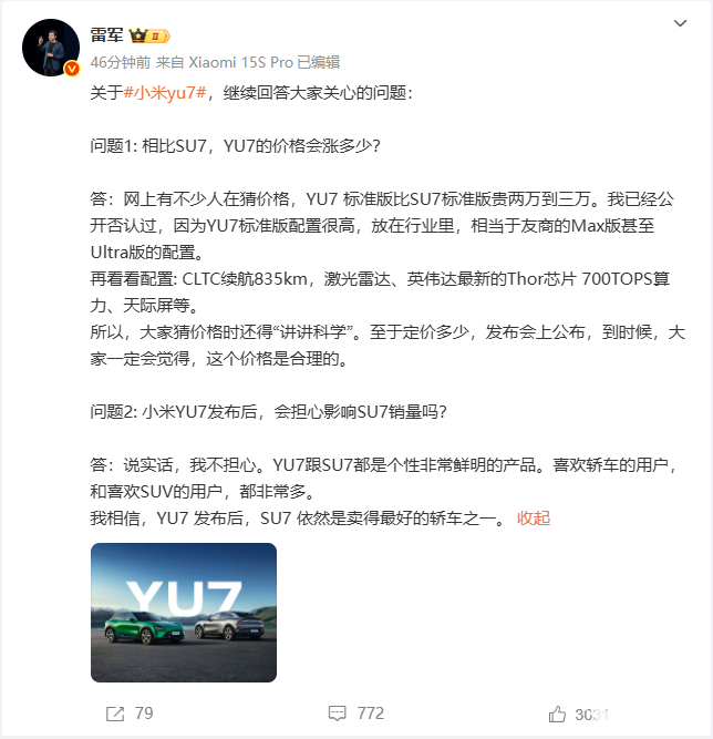 6月25日中午,小米创办人、董事长兼CEO雷军在微博上又回答了小米YU7网友关心的一些问题。他提到YU7标准版价格比SU7标准版贵2-3万元的消息不实。